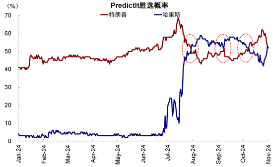 图表:从博彩赔率上看,近期民主党哈里斯选情有所回升,大选不确定性犹存