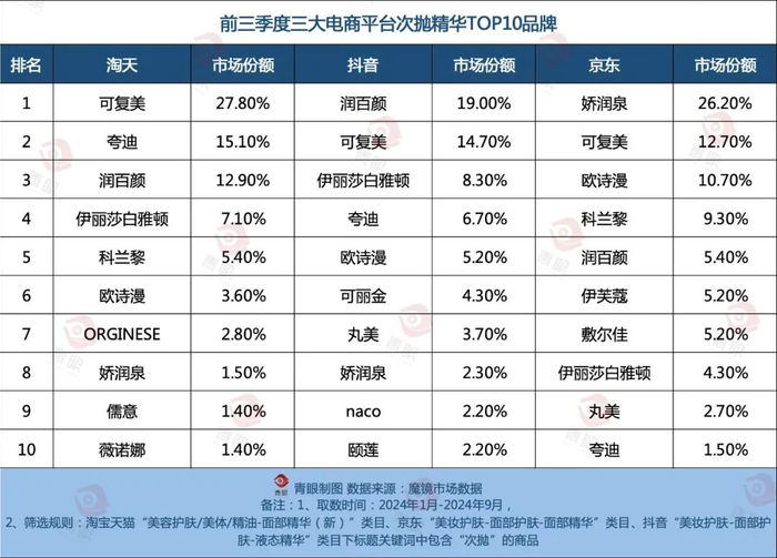 值得一提的是,虽然最早的“次抛”的火是由润百颜、夸迪等品牌燃起,但目前来看,次抛市场已然呈现百花齐放的市场格局,且头部市场份额均由国货品牌占据。例如,据魔镜市场数据,前三季度淘天TOP10品牌中,仅有伊丽莎白雅顿、科兰黎和ORGINESE三个外资品牌,抖音更是9成均为国货品牌。