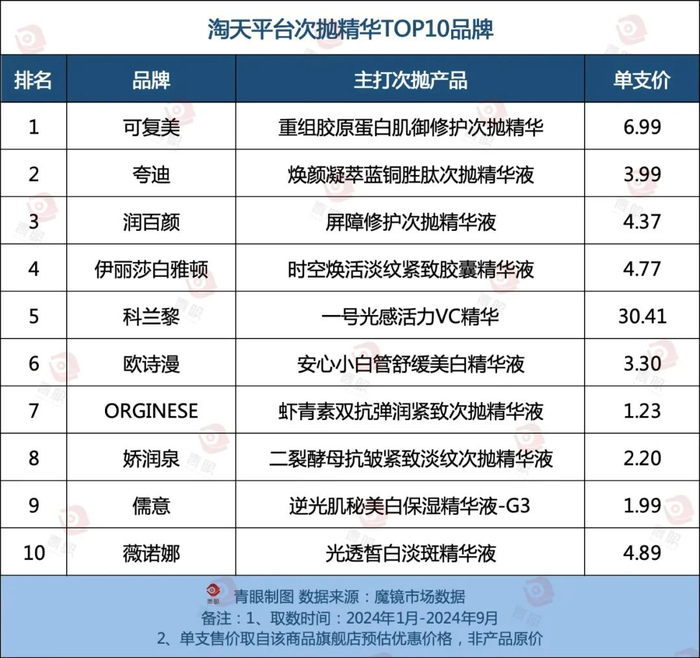 以淘天平台前三季度次抛品类TOP10品牌的主打产品为例,除可复美和科兰黎外,其他品牌次抛产品单支售价均在5元以下,ORGINESE、儒意单支售价甚至不到2元。