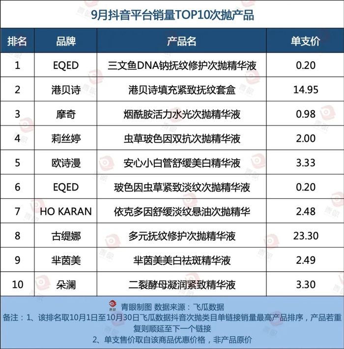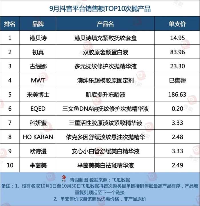 有意思的是,青眼注意到,从抖音单月销量榜单来看,次抛产品价格差异较大。除低价次抛产品外,也有一批高价次抛产品出现,价格甚至超过科兰黎等知名外资品牌。例如,位列9月抖音销售额TOP2的初真双胶原奢颜蛋白液,单支售价甚至超80元。