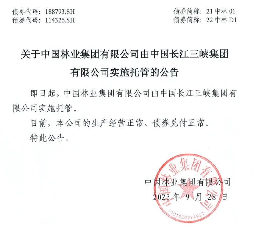 2023年9月,中国林业集团发行的公司债券“21中林01”发布公告称,即日起,中国林业集团有限公司由中国长江三峡集团有限公司实施托管。