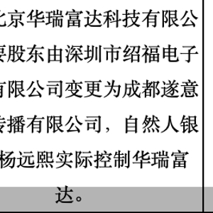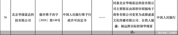 根据人民银行最新信息公示,同意北京华瑞富达科技有限公司主要股东由深圳市绍福电子商务有限公司变更为成都遂意文化传播有限公司,自然人银鑫、杨远熙实际控制华瑞富达。