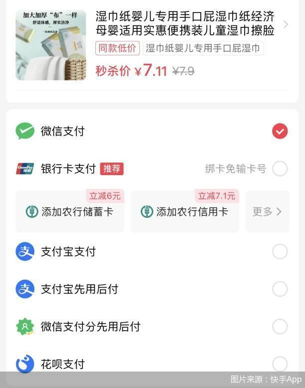 北京商报记者实测发现,在“快手小店”内购买商品,支付时可选择跳转微信、支付宝,或绑定银行卡。在不同店铺下单,收款商户名称都显示为“快手小店平台商户”。多家站内商户及平台官方客服均表示,消费者付款后,货款会先经过快手平台托管,待消费者确认收货后的7天后,商家可以收到货款。