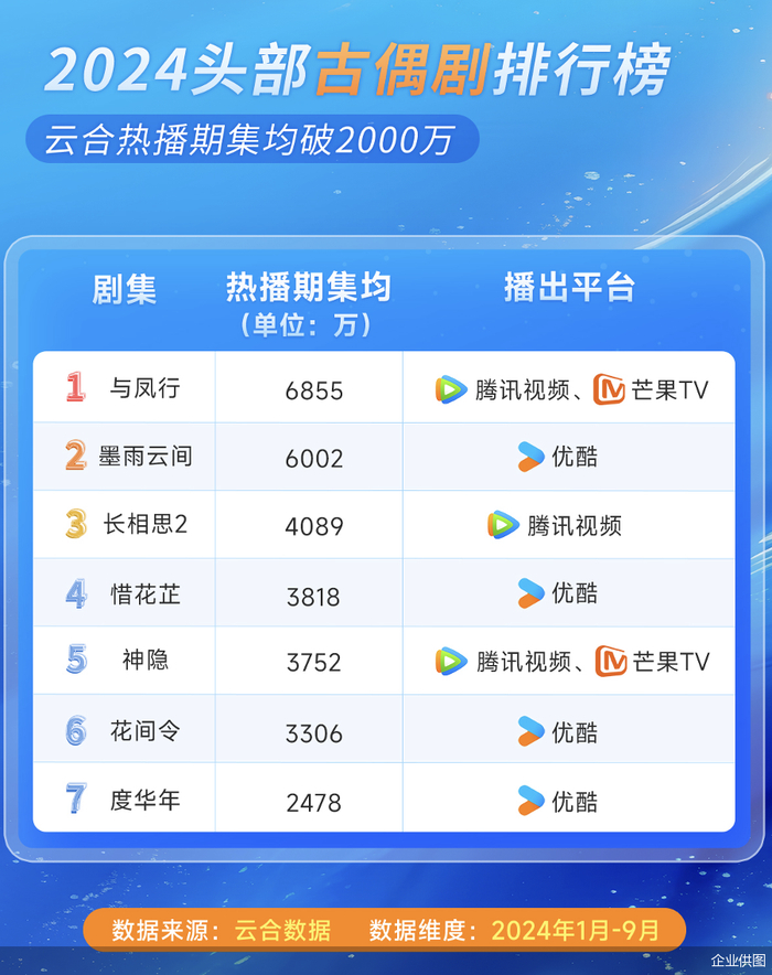 云合数据显示,今年1月至9月,古偶剧云合热播期集均破2000万播放量的有7部,优酷占了4部。