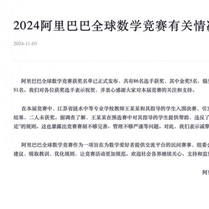 同日,江苏省涟水中等专业学校发布情况通报称,据调查了解,在2024阿里巴巴全球数学竞赛预选赛中,该校教师王某某对指导的学生提供帮助,违反了预选赛关于“禁止与他人讨论”的规则。