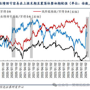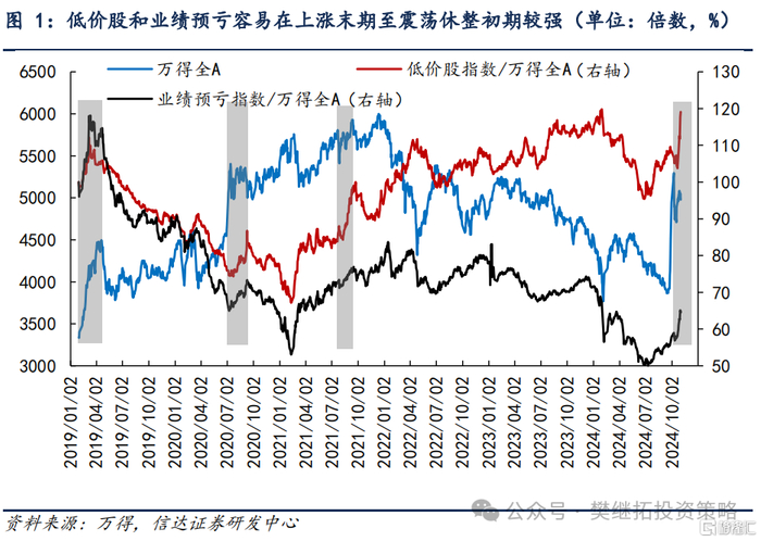 (1)近期游资风格很强,这种分化其实经常出现。10月的市场风格分化很大,交易性资金非常活跃,但机构相关重仓个股表现较弱。如果以低价股和业绩预亏指数来看,10月下旬超额收益大幅上行。这种分化让很多人投资者感慨资金比基本面更重要,那么这种风格能否持续?我们可以先参考2019-2021年牛市期间,低价股和业绩预亏指数超额收益与市场的关系能够发现,2019年2-4月、2020年7-9月、2021年7-9月,低位亏损个股的表现均强于指数。这三个阶段均是指数一波季度上涨的后期至震荡休整初期。所以在牛市中,低位亏损个股表现较强,可能是一个季度上涨波段后期,市场很快或正在震荡休整的标志。