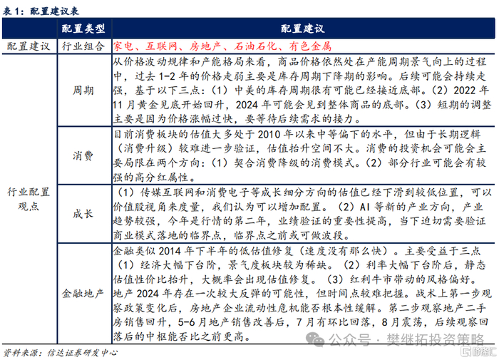 建议配置顺序:上游周期(产能格局好+需求担心释放已经充分)> 出海(长期逻辑好)> 传媒互联网&消费电子(成长股中的价值股)> 金融地产(政策最受益)> 新能源(超跌) > 消费(超跌)。历史上熊转牛第一波,企稳初期较易偏向大盘,但季度反转到中后期风格可能会快速变为小盘。如果底部反转,高PE板块(成长风格)大多情况下表现较好。历史上重要底部反转的第一波上涨,成长风格通常表现更强。但从节奏上来看,大多数情况下,底部反转后的第1个月会是价值风格的板块先涨,到反转后2-3个月成长风格的板块开始变强。随着第一波上涨进入尾声,配置策略可以降低弹性配置。高现金流回馈股东(高ROE低PB)、上游周期、出海,这些配置方向,产业逻辑和之前牛市不同,可能发展为新一轮牛市的最强主线。