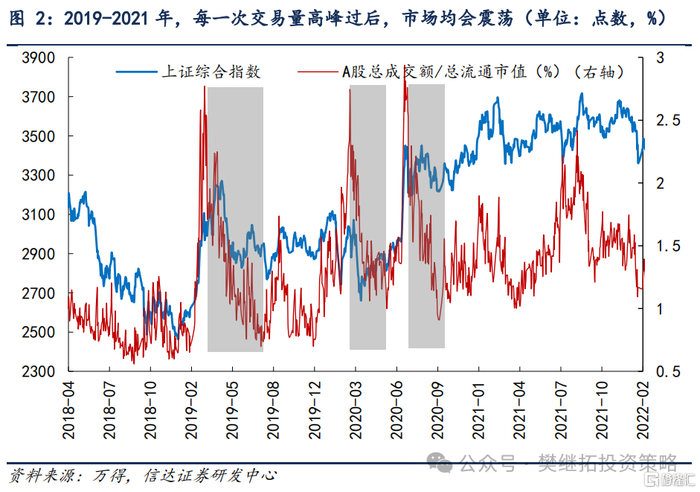 (2)短线游资风格依赖市场高交易量,交易量存在季度内持续下降的可能。短期交易性资金非常依赖市场的高成交量。而如果观察换手率(成交额/总流通市值)的波动,相对指数的波动往往更剧烈。2019-2021年的牛市始于2019年,随后指数中枢不断抬升,但换手率则是1-2个季度脉冲性回升后,大幅下降,之后再次脉冲性回升。交易量下降期,指数中枢通常较难跌回原点,但换手率有跌回原点的可能。