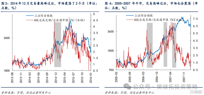 2014-2015年牛市和2005-2007年牛市期间,换手率中枢和指数中枢都会明显回升。不过换手率的波动还是比指数更大。2014年12月-2015年1月、2006年6-8月、2007年1-3月、2007年5-7月,均出现了换手率的明显下降。