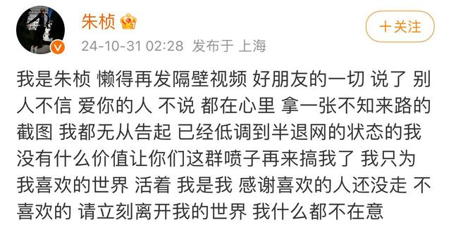 对此,朱桢10月31日凌晨2时28分在微博发文否认传闻,称对着一张不知来路的截图,他都无从告起,“好朋友的一切,说了,别人不信,爱你的人,不说,都在心里……已经低调到半退网的状态的我,没有什么价值让你们这群喷子再来搞我了……”