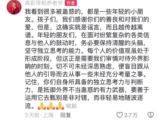 不过,仍有部分网络用户不信乔任梁父母的回应,称他们“不敢说出‘真相’”,甚至有用户私信谩骂,斥责两位老人“委曲求全”“收钱噤声”“懦弱”,一切都是为了“往直播间引流”。