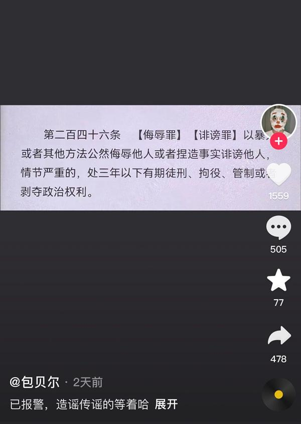 演员包贝尔也于10月31日晚在抖音发文称:“已报警,造谣传谣的等着哈。”
