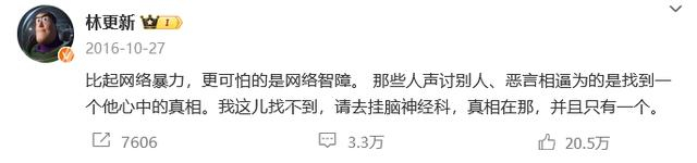 在乔任梁去世一个多月后,林更新在微博发文回怼谣言:“比起网络暴力,更可怕的是网络智障。 那些人声讨别人、恶言相逼为的是找到一个他心中的真相。”