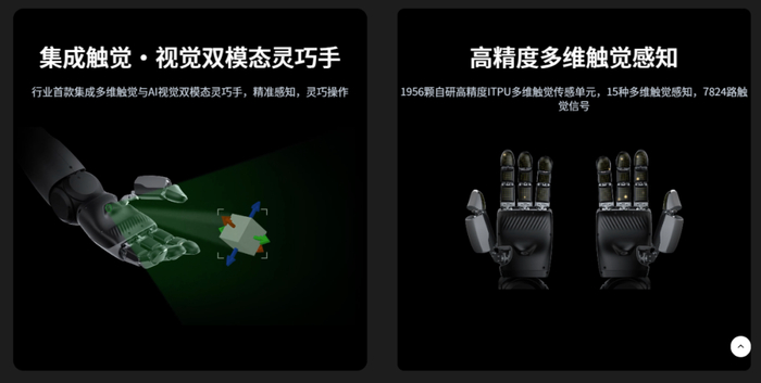 DexH13具有13个自由度,双手搭载世界上最多的1956颗专业级ITPU多维触觉传感器,带来惊人的7824路触觉信号解析能力,具备15种多维触觉感知能力,在感知能力上比前一代更全面更精准,赋予其如人类般细腻灵敏的触觉。