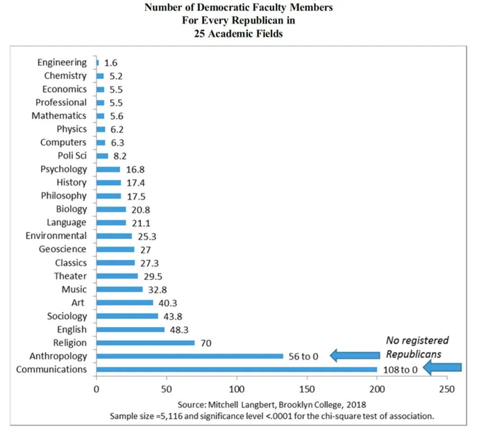 Langbert仔细考察了不同专业教授的D:R(民主党:共和党)比例。首先,从类别上来说,虽都不均衡,但理科比社会科学和人文学科相对平衡,而意识形态根深蒂固的跨学科研究则最为极端。细分专业来看,工程学教授D:R的比例约为1.6:1,而传播学可以达到56:0,跨学科研究甚至是108:0。
