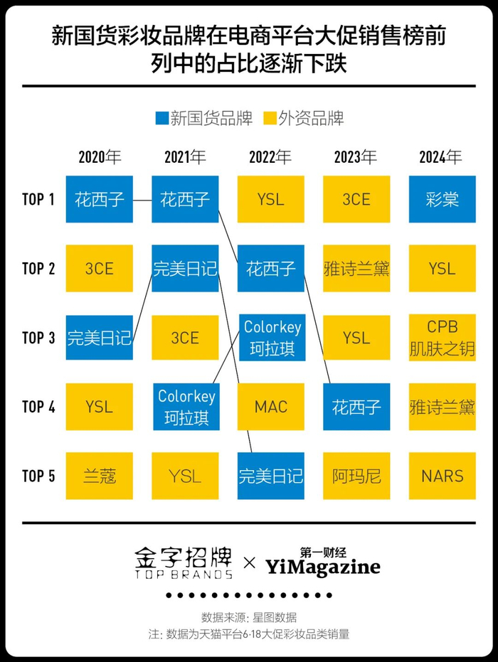 但随着流量见顶和价格增高,靠流量支撑销量的打法对增长的助力逐渐减弱。在今年的6·18榜单中,除了珀莱雅集团的彩棠仍位列彩妆榜前列,其余头部品牌变回了前几年在流量战中略逊一筹的国外品牌。对于那些在流量泡沫消失后退步的品牌,你能回忆起它们让人想反复购买的主打产品是什么吗?