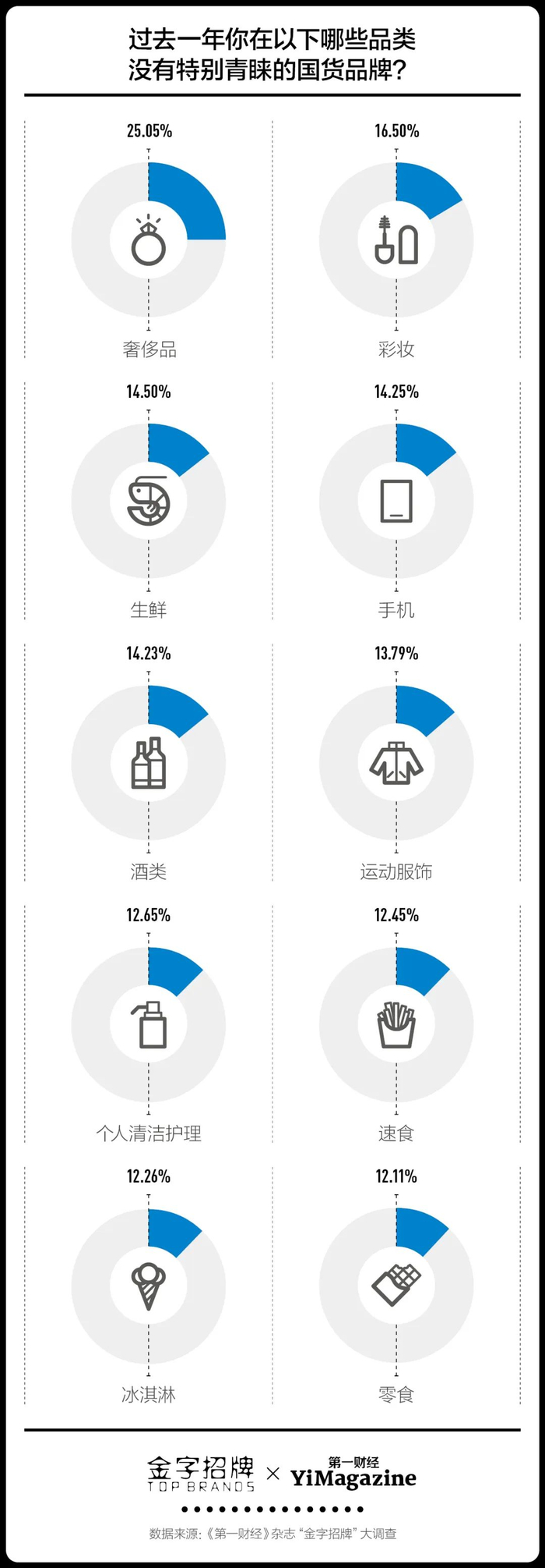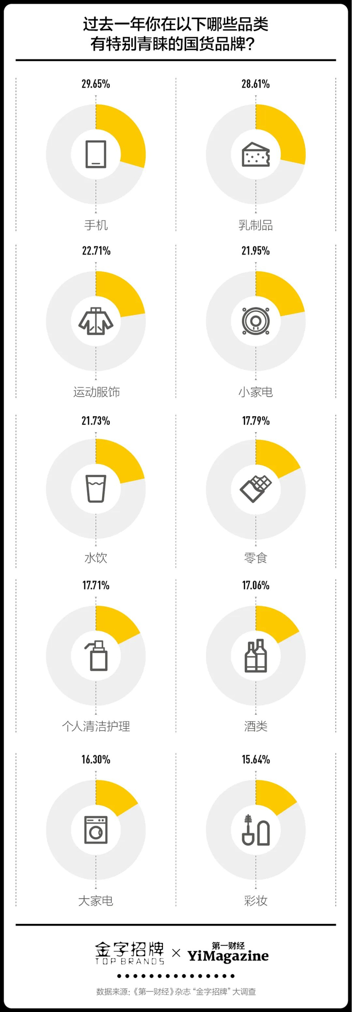 在今年的金字招牌大调查中,我们增加了消费者国货青睐度的调查。手机、乳制品、运动服饰、小家电和水饮是消费者国货品牌青睐度Top 5的品类,青睐度占比均超过5成。随着消费者对国货越来越认可,我们决定不再继续开展新国货这个带有鼓励性质的调查,让新国货离开新手保护村,在更大的舞台上平等地与各方竞争者角逐。