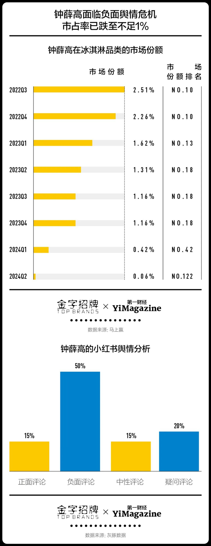 最显著的冲突就是消费者在2022年创造“雪糕刺客”一词,对雪糕动辄两位数的价格的合理性提出了直接的质疑。一些品牌作出了应对,“雪糕刺客”事件的核心品牌之一钟薛高也推出了5元的产品。但没有妥善处置“火烤不化”这样直指产品品质本身的负面舆情,令它陷入败局。根据快消品零售监测平台“马上赢”的数据,2022年第三季度,钟薛高还保持了2.51%的市场份额,在冰淇淋品类中排名第十,到了今年第二季度,其市场份额已不足0.1%,排到了百名开外。高价雪糕市场在今年沉寂下来。