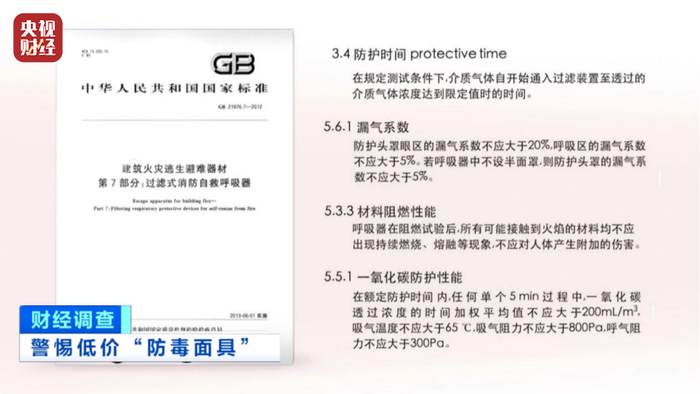 总台记者围绕着国家标准对这家企业生产的过滤式消防自救呼吸器进行了四项测试实验,分别是一氧化碳防护性能测试、滤烟性能测试、面罩牢固强度测试、面罩阻燃性能测试。
