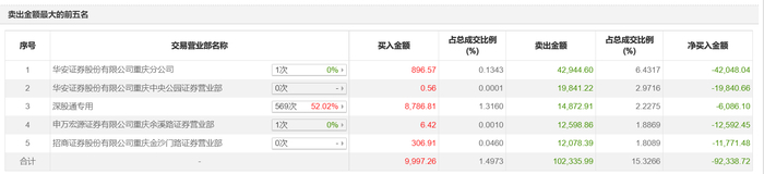 当日,华安证券重庆分公司卖出4.29亿元,华安证券股重庆中央公园证券营业部卖出1.98亿元,申万宏源重庆余溪路证券营业部卖出1.26亿元,招商证券重庆金沙门路证券营业部卖出1.21亿元。四家位于重庆的营业部仅一日合计卖出约8.74亿元。四家营业部中有2家营业部均属于华安证券。
