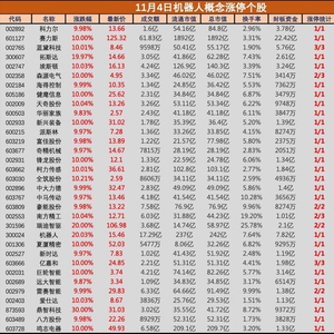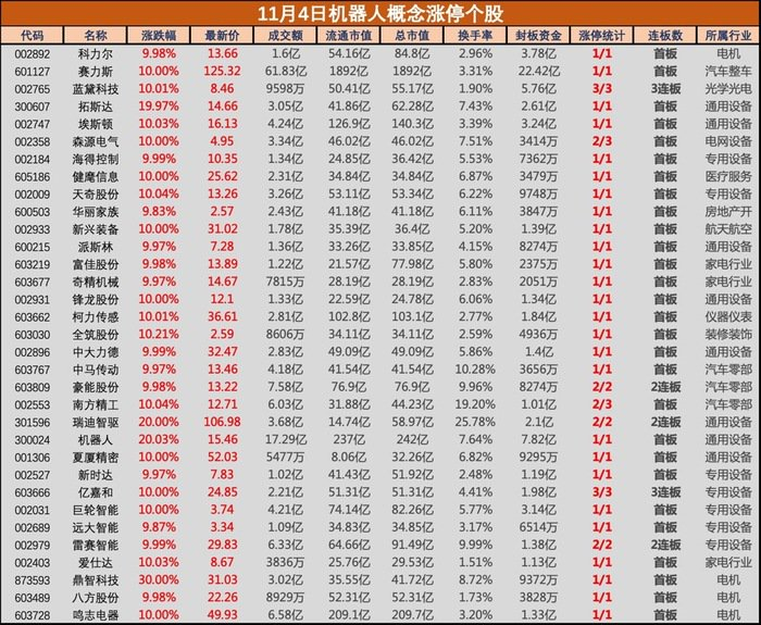 11月4日,机器人板块集体大涨,科力尔(002892)、爱仕达(002403)、中大力德(002896)、夏厦精密(001306)、新时达(002527)等多股涨停,丰立智能(301368)、江苏雷利(300660)、德恩精工(300780)等多股跟涨。