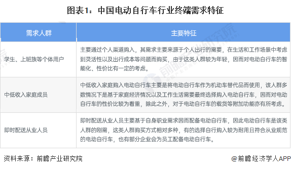 中国电动自行车行业需求人群主要可以分为个体用户以及特定从业人员,其中个体用户主要包括上班族、学生等对短途出行有需求,且不方便使用机动车人群,或是中低收入家庭人员;而特定从业人员主要包括外卖员、快递员等即时配送从业人员,其具体需求特征如下: