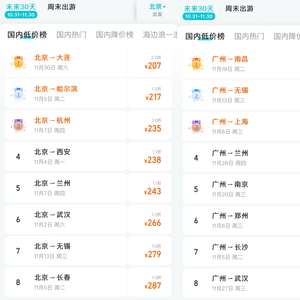 例如,北京飞往大连、哈尔滨、杭州、西安、兰州等地的机票价格在300元以下;广州飞往南昌、无锡、上海、兰州、南京、武汉等地的机票价格也在300元以下;而上海飞往大连、长沙、厦门、长春、沈阳等地的机票价格甚至在200元以下。这样的价格优势,无疑为错峰出行的游客提供了巨大的吸引力。