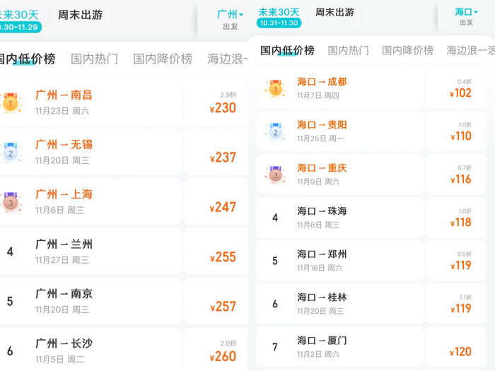 去哪儿平台数据显示,换季后,飞往东北、新疆、海南票价同比降低10%;国际航线中,飞往新加坡的机票价格同比降低10%。整体来看,四季度飞往热门目的地票价同比下降7%,环比十一假期下降了近四成。