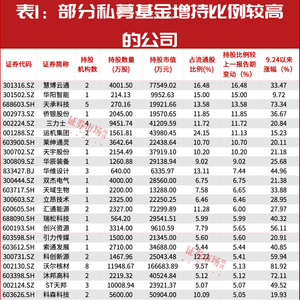 新一报告期末被私募基金新进重仓或继续加仓的公司中,131家增持比例超过了1个百分点,且二级市场中,多家近期得到了资金的高度认可,股价涨势喜人(见表1)。