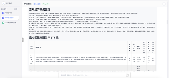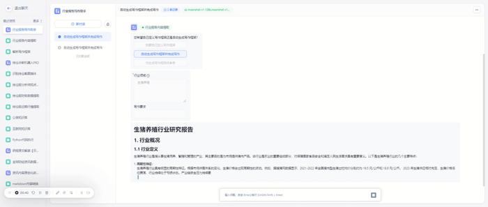 对知识库内容要求更加深入的研究报告撰写方面,FinGo也能够做到精准抽取并总结形成通顺的长文本。通过知识库中针对行业的研究内容,FinGo可以抽取对应的知识,用户能够自由制定行业领域,自动生成写作框架,并且生成深度的行业研究报告。基于FinGo的复杂工作流解决知识精确抽取和超长文本生产难题。