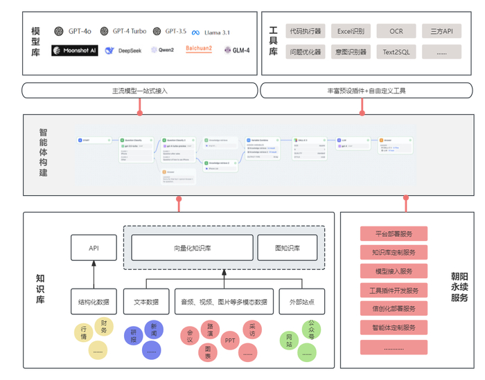 在这样的AI智能体平台上,用户可以根据自有的知识库内容,结合朝阳永续的全量知识库,借助各种类型大模型的处理能力,随心构建贴合业务的AI应用。