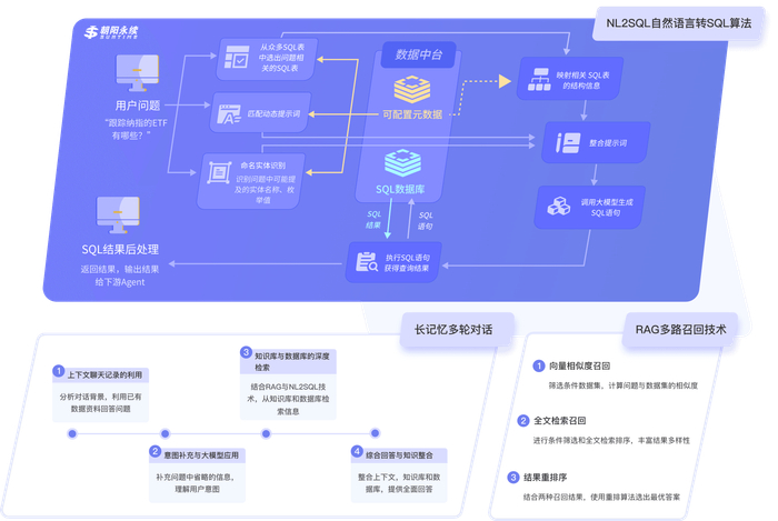 面对自然语言提取金融数据的问题上,朝阳永续基于其在数据处理领域多年的经验积累的元数据体系构建了NL2SQL的方案,实现用自然语言调取金融数据。在AI问ETF的应用中,NL2SQL也得到了技术验证。