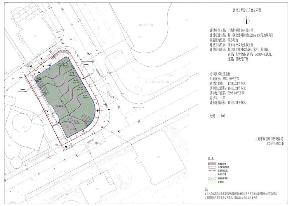 据上海市规划和自然资源局官网公示,虹口区北外滩街道HK286A-03c号地块项目工程设计方案规划用地性质为商办用地,建设单位为上海恒耕置业有限公司。