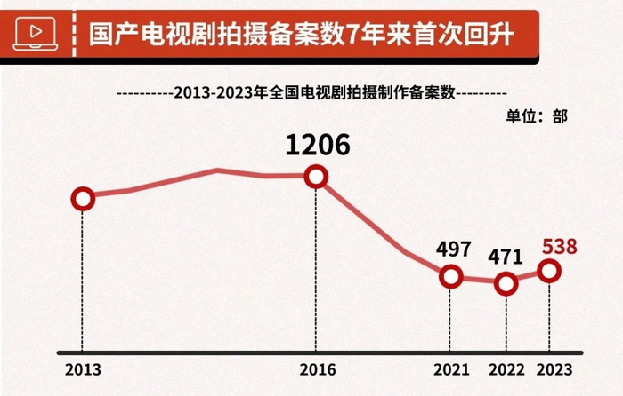 鉴于2022年、2023年古偶的强势表现,制作方加大了对于古偶的投入,根据官方数据显示,2023年年度电视剧与网络剧备案数538部,其中古装剧数量大幅增加,全年通过备案的古装电视剧共73部,占比约13.5%,创下四年来新高,而古装网络剧多达168部,占比约30%。