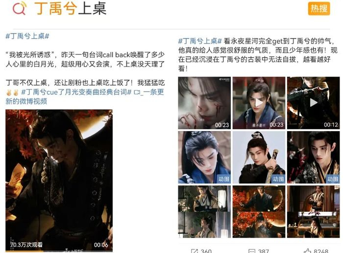 与此同时,曾经被网友所抵制的古偶男主丁禹兮,也因为在《永夜星河》里的妆造、人设变化,成功让网友喊出了#丁禹兮 上桌#的热一话题,足见古偶对于上升期演员的魔力。