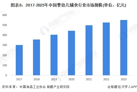 考虑到近年来婴幼儿辅食市场产品同质化严重,价格竞争较为激烈,前瞻初步核算2023年中国婴幼儿辅食行业市场规模约553亿元。