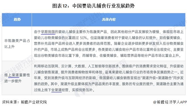 中国婴幼儿辅食行业将呈现非饱腹类产品占比上升、线上渠道重要性进一步提升等发展趋势: