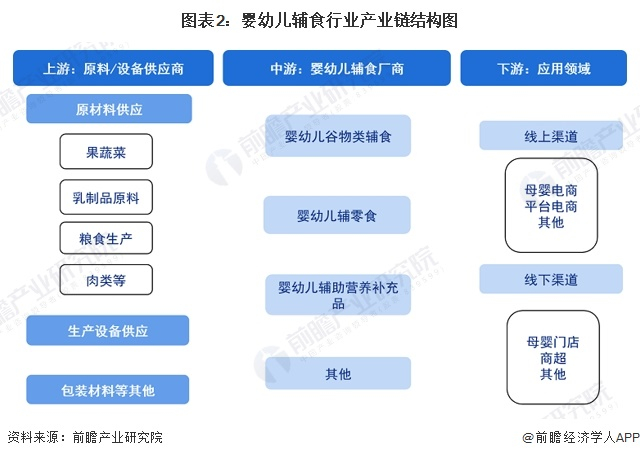 婴幼儿辅食产业链上游市场参与者主要为粮食、畜禽肉、果蔬、生鲜乳、乳制品原料等农副产品以及生产设备、包装材料等原材料供应商;中游主体为婴幼儿辅食生产商,主要生产婴幼儿谷类辅助食品、婴幼儿罐装辅助食品和辅食营养补充品等产品;下游涉及销售渠道和消费者,销售渠道主要包括母婴店、专卖店和商超等线下渠道及天猫、京东、考拉等线上渠道,婴幼儿辅食产品通过这些销售渠道流向终端消费者。