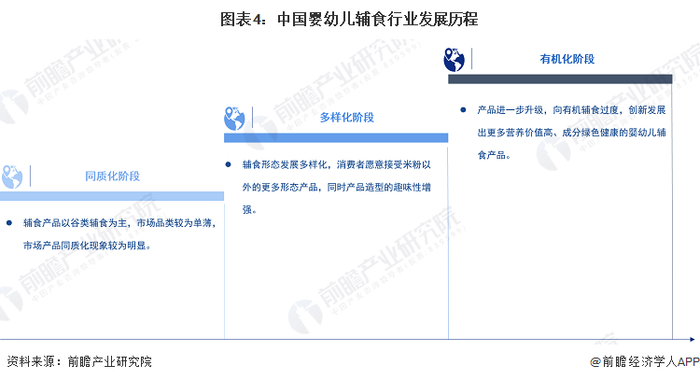 国内婴幼儿辅食行业发展至今已有70多年,目前行业已经形成一定的规模。从发展历程来看,我国婴幼儿辅食行业大致经历了同质化阶段、多样化阶段、有机化阶段等,目前已处于有机化阶段。