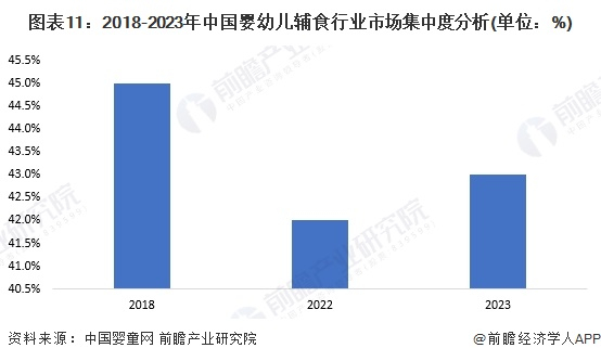 根据中国婴童网发布的《中国婴幼儿辅食产业发展蓝皮书》数据,2018年我国婴幼儿辅食行业中CR10集中度为45%。由于近年来行业发展速度较快,新进入企业在市场中发展迅速,许多初创企业也占据了一定的市场份额,前瞻结合历年双十一天猫宝宝辅食销售额情况变化分析,2023年中国婴幼儿辅食行业的CR10市场集中度较2018年有所下降,约为43%。