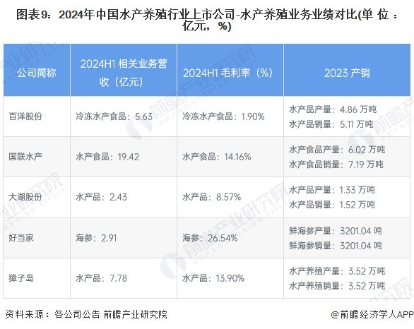 从上市公司水产养殖相关营收来看,2024年上半年,国联水产的水产养殖相关业务营收接近20亿元;从上市企业相关业务毛利率情况来看,国联水产和好当家水产养殖业务的毛利率处于领先。