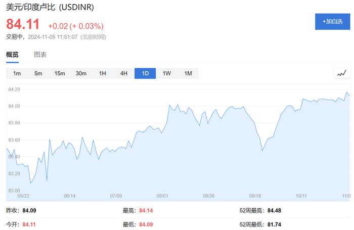 印度卢比也跌的厉害,截至发稿,美元兑卢比报84.11,已接近历史高点84.14。