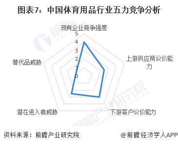 从五力竞争模型角度分析,目前,我国体育用品行业现有企业非常多,龙头企业之间的竞争较为激烈;上游供应商主要为各类非金属原材料和金属原材料,议价能力较低;而下游需求市场主要为各类需求群体等,议价能力一般;同时,行业进入存在资金、技术门槛,潜在进入者威胁一般;从当前的发展趋势来看,我国体育产业正处于稳步发展态势,体育用品的替代威胁较小。