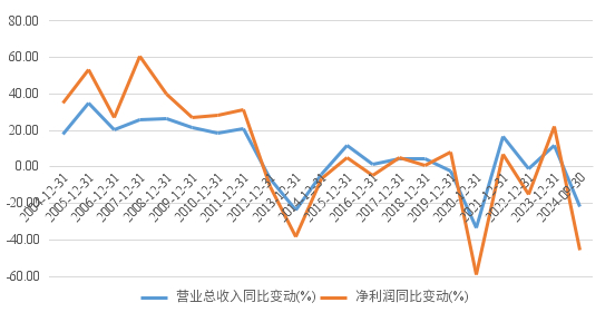 张裕A近20年营收净利润同比变化情况