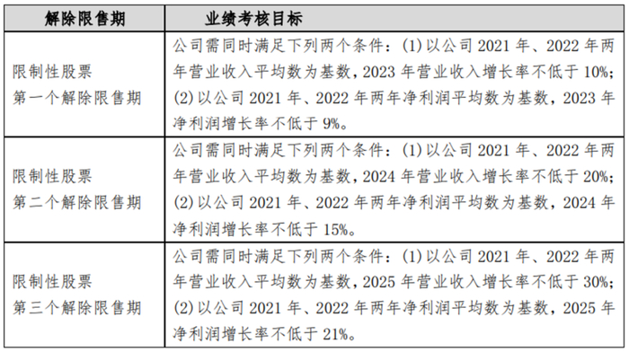 2023年6月,张裕A发布了限制性股票激励计划,拟向董事长、高管及核心技术人员等共204人,授予685万股限制性股票。授予的前提是完成业绩考核目标,其中第一个解除限售期的业绩考核条件是以公司2021年、2022年两年营业收入平均数为基数,2023年营业收入增长率不低于10%;以及以公司2021年、2022年两年净利润平均数为基数,2023年净利润增长率不低于9%。后续还有第二个、第三个解除限售期业绩考核条件。在完成业绩目标后,激励对象可以15.24元/股的价格购买公司股份,这个价格几乎是当时张裕股价的一半。