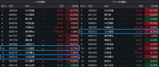 热度最高的,当属“川大智胜”。wind显示,其在十二小时最热榜单里位列第6,今日股价盘中一度接近涨停。