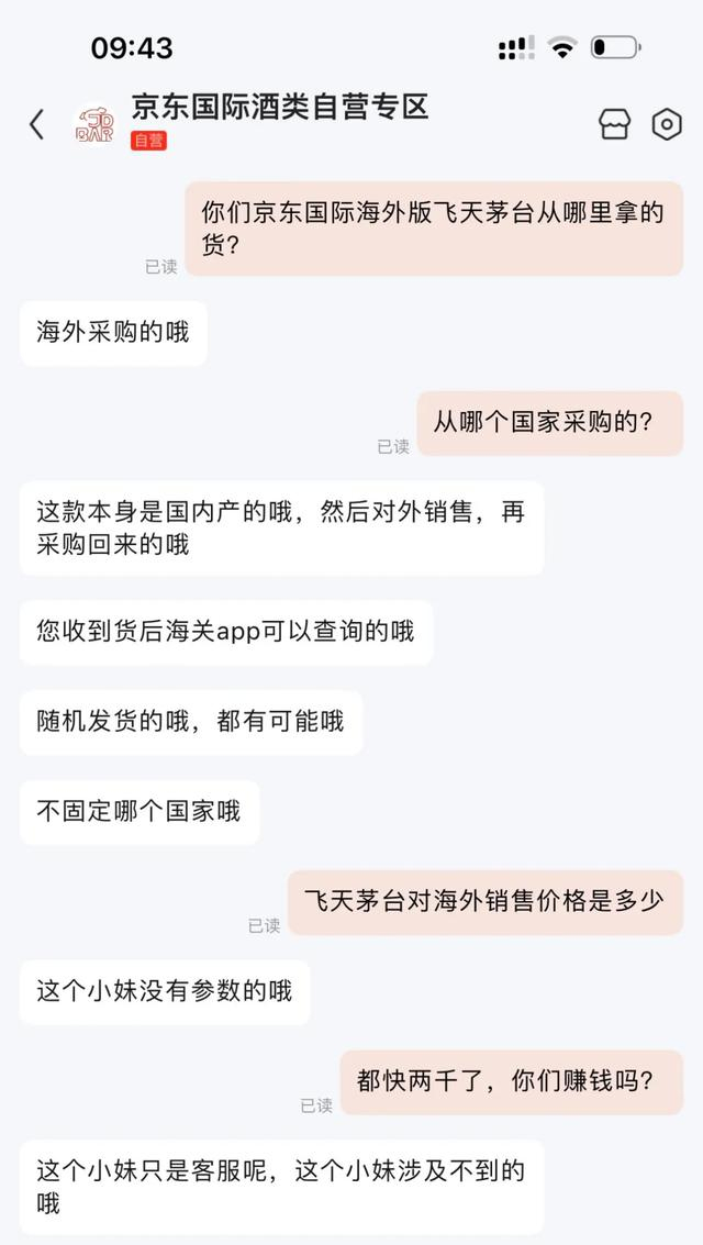 当食悟问到飞天茅台海外销售的价格、也就是京东海外采购飞天茅台的采购价是多少的时候,京东客服有点崩了:“我们只是客服,涉及不到(这些商业机密)的”。