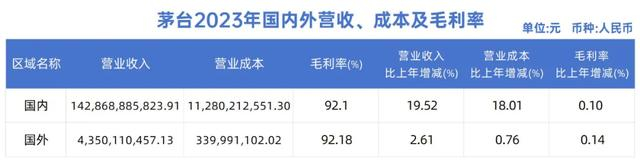值得关注的是,2023年茅台海外毛利率92.18%,国内毛利率92.10%,海外毛利率比国内还高0.08个百分点。