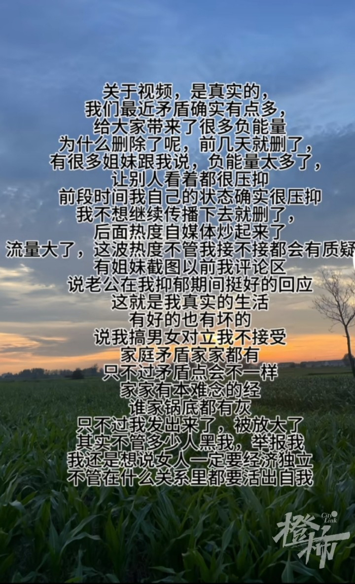 不过很快原视频就被删除,11月3日当事人在平台上发文称,她和丈夫最近矛盾确实有点多,视频是真实的,因不想继续传播负能量,所以就删除了。