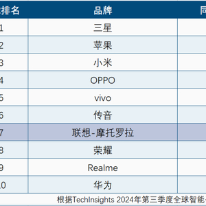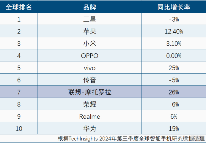 全球领先的市场研究和技术分析公司TechInsights最新报告显示,2024年第三季度全球智能手机出货量同比增长3.8%,达到3.077亿部,持续四季度复苏。其中,联想-摩托罗拉以最高的26%的同比增长率领跑市场,全球排名上升到第七位。